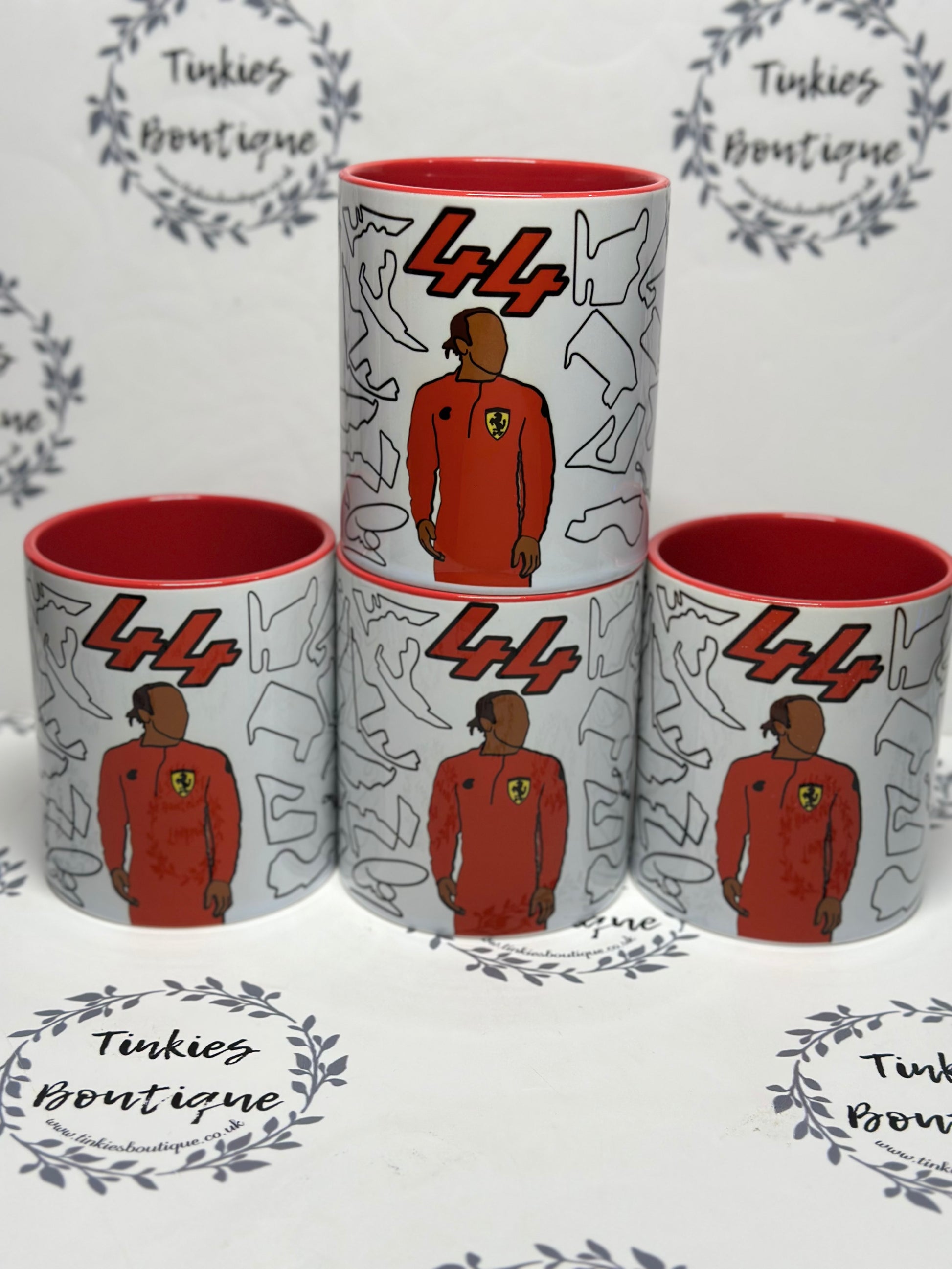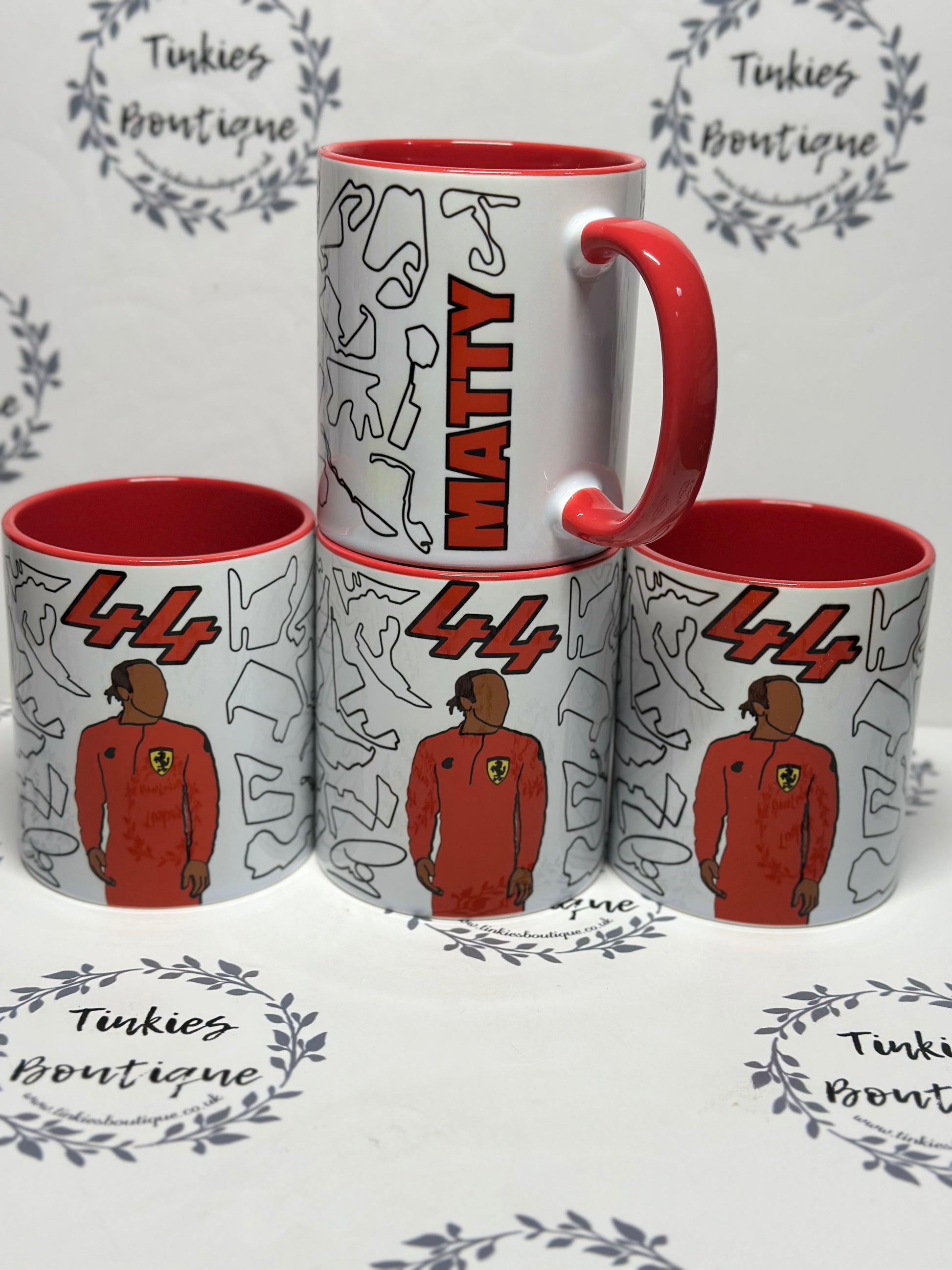 Personalised Ferrari Formula 1 Racing Mug – Driver #44 & Driver #16 with F1 Track Design
